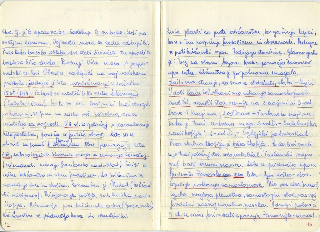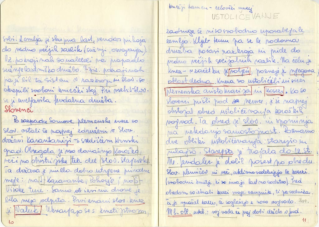 Tako iz poglavja o Slovencih kot iz celotnega zvezka je razvidno, da sem se tudi učila. Imela sem svoj sistem podčrtovanja – stran sem si zapomnila vizualno. Če je pri spraševanju zmanjkalo »špagce«, sem zaprla oči in skušala prebrati napisano. Na prišepetavanje se namreč nisem mogla zanašati, ker sem bila že takrat malo gluha. V razredu so bile tri vrste klopi. Sedela sem v drugi klopi prve vrste. Prva, piflarska klop, je bila prazna. Pritegnila sem si stol pri prvi mizi in položila noge nanj. Kako je pasalo. Nekaj časa. Potem se je zaslišal profesorjev nejevoljni glas: »Milavec! Kako sedite!« Zravnala sem se, a ni dolgo trajalo. Ponovno sem stegnila noge na stol. To se je ponovilo še dvakrat. V tretje ni bilo opozorila ampak mi je profesor potegnil stol izpod nog in ga porinil pod mizo. Potem je bil mir. V resnici ne pišem tako grdo, kot je videti v zvezku, ampak je bilo treba hiteti, da nisi česa izpustil. Po koncu ure je imel sredinec, na katerega je bil prislonjen nalivnik, skoraj pravi žulj.