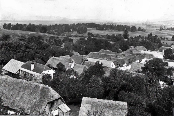 Večina stavb je še krita s slamo, tako tudi našemu očesu najbližja mežnarija tik pod pokopališčem, pod njo pa Herblanova kašča, varuhinja telesne trdnosti, ki se skoraj v isti smeri kot cerkev ozira po bregu, ob katerem se spuščata lepo poravnani vrsti hiš. Poslopja s krajnih strani objemajo bujne krošnje starega sadnega drevja. Le tu in tam je med sardinasto nagnetenimi grunti toliko prostora, da mejo med dvema domačijama zapolnjujejo posamezna drevesa in ponekod (objektivu nevidni) vrtički. Zgornjo tretjino Kregarjeve vedute robijo obdelovalne površine, ki v trakovih nadaljujejo razpotegnjene linije človeških in živalskih bivališč. Specifične danosti leče ali pa sparina odstirata le še drevje ob Žerovniščici, ki se vije proti Cerkniškemu jezeru. V ozadju so komaj vidni obrisi osrednjega dela Cerkniškega polja: proti levi slutimo jezero ali jezersko dno, proti desni strani pa si lahko predstavljamo hrbet in vrh Slivnice, ki tedaj še ni bila tako zaraščena.