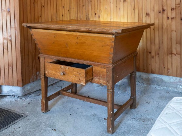 Najzanimivejši predmet na Kregarjevi fotografiji je element, ki zajema četrtino slike, vendar po mojem mnenju to ni »mentrga«. Beseda »mentrga« je verjetno popačenka nemškega izraza »Mehltruhe«, podobno je izvorno tvorjena in popačena beseda »šajtrga« (bavarsko »Scheibtruhe«), gl. https://fran.si/193/marko-snoj-slovenski-etimoloski-slovar/4293170/truga?View=1&Query=truga Kot kaže spodnja fotografija, ima taka mentrga, ki je verjetno kar značilna za naše kraje, kot srna tanke nožice, ki podpirajo predal pod ožjim dnom korita.
