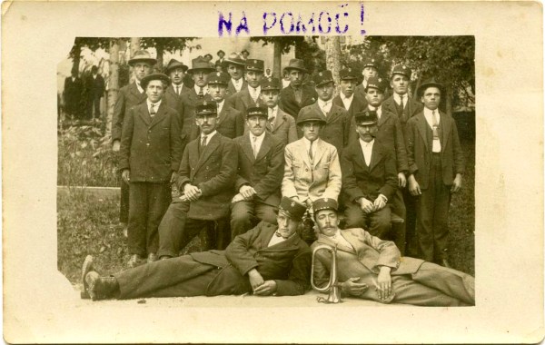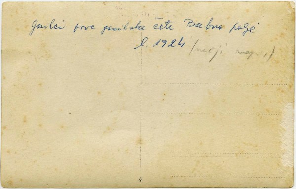 Na sprednji strani slike je vijolična štampiljka z gasilskim geslom Na pomoč!, na hrbtni strani pa ličen moder zapis: “Gasilci prve gasilske čete Babno Polje l. 1924”. Mogoče je fotograf napravil za vsakega moža po eno sliko za spomin …