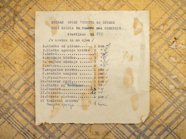 Ravno sem ugotovil, da na Stareslike nismo še nič napisali o tem, kako smo hodili v kolonijo. Isti dan mi je v kleti pod roke prišel kovček, s katerim sem bil trikrat v koloniji. Zanimiv je seznam vsebine, ki sem jo vzel s seboj v kolonijo. Seznam je bil uporaben tudi za naslednje leto, le številko smo popravili.
