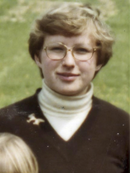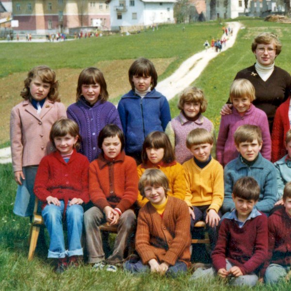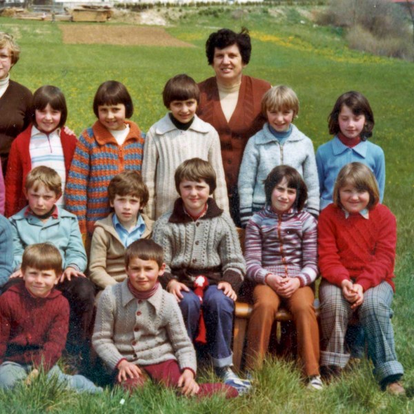 Kar dve učiteljici in 2. razred v šolskem letu 1978/79 osnovne šole Begunje, slikan v naravi.