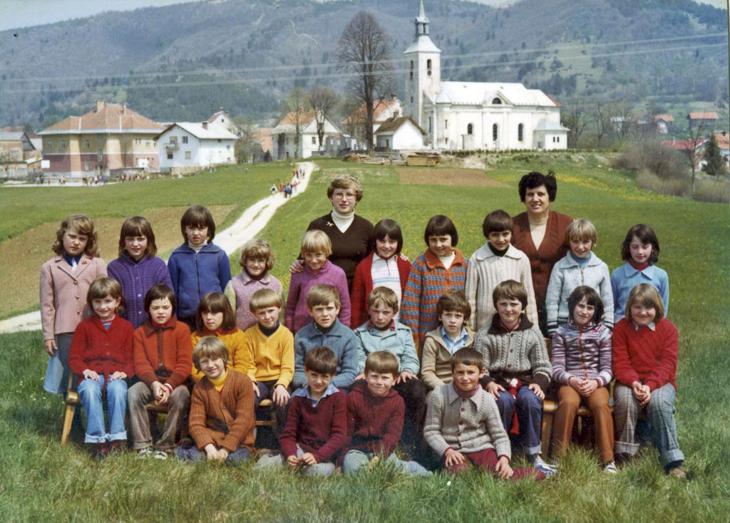 Tokrat je fotograf učence povabil na travnik. Očitno so se učenci na tej lokaciji izmenjavali, saj se jih kar nekaj vidi v ozadju in tudi še v bližini šole. Zadaj vidimo šolo z zadnje strani in cerkev sv. Jerneja. Razredničarka je bila Jožica Košir. Z njimi je slikana tudi bodoča učiteljica Marta Pirman iz Svetega Vida. Šola jo je prosila za nadomeščanje nekaj ur na teden. Tako si je pridobivala delovne izkušnje še kot študentka.