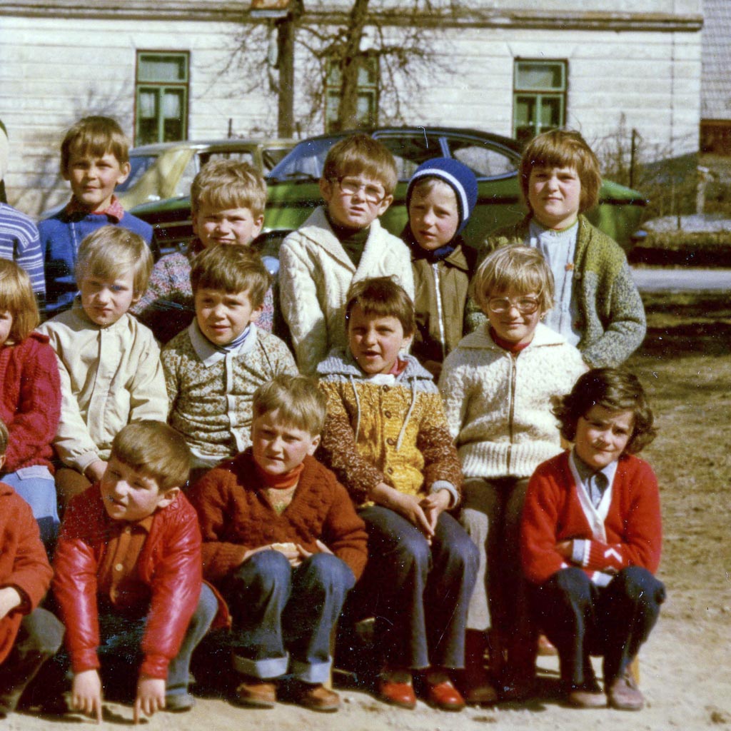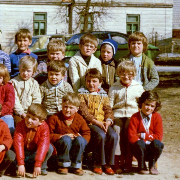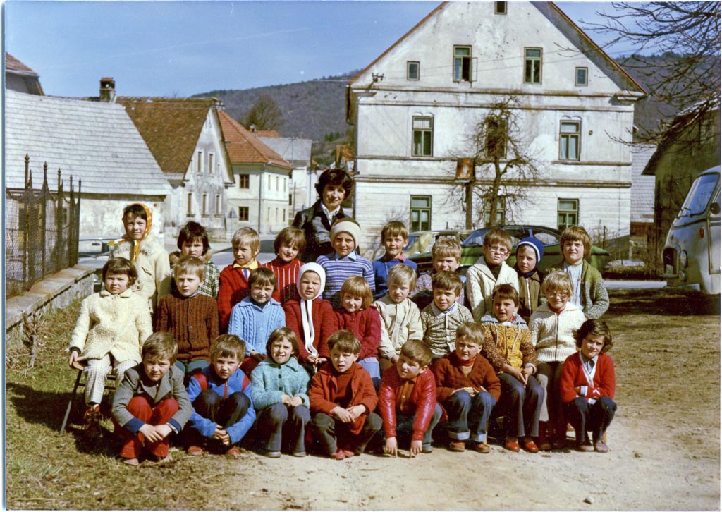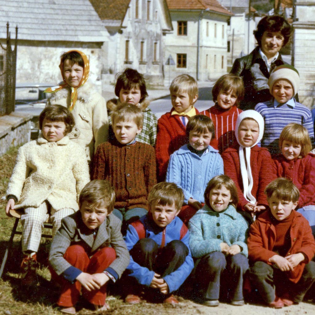 Z vzgojiteljico Marinko Kralj ob šoli v Begunjah slikana skupinica otrok iz male šole iz šolskega leta 1977/78.