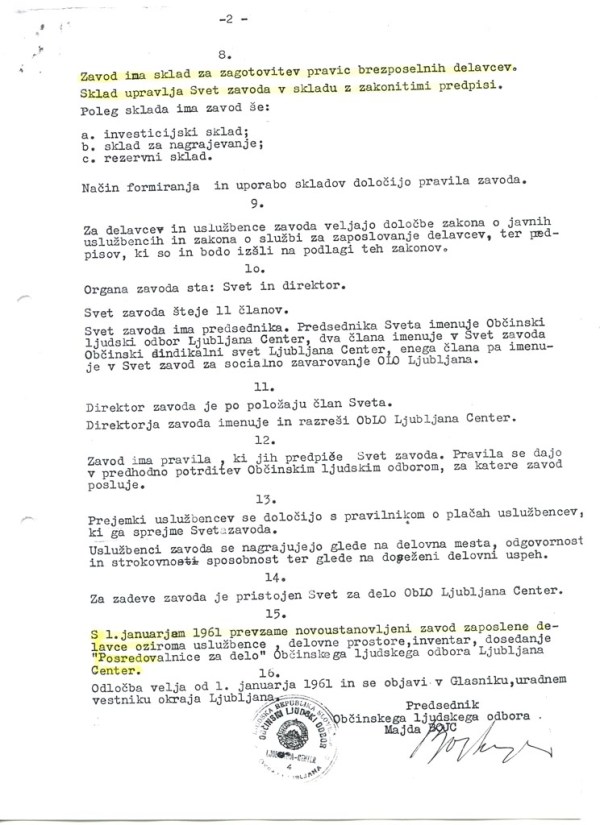 Zakon o službi za zaposlovanje delavcev, ki je bil razglašen 2. 7. 1960, je poveril opravljanje te službe Zavodom za zaposlovanje delavcev, ki so bili ustanovljeni za eno ali več občin. Zavod je za območje občine ustanovil občinski ljudski odbor, za republiko pa izvršni svet. Občinski ljudski odbor je na seji Občinskega zbora in Zbora proizvajalcev dne 29. 12. 1960 sprejel Odločbo o ustanovitvi Zavoda za zaposlovanje delavcev Ljubljana. Sedež zavoda je bil na Gosposvetski cesti 17 (bivša Delavska zbornica). Zavod je opravljal naloge, določene z Zakonom o službi za zaposlovanje delavcev in v drugih ustreznih predpisih. Dohodki zavoda so se ustvarjali iz prispevka za zaposlovanje, dotacij iz občinskih proračunov, za katere je zavod delal, in ostalih dotacij. Zavod je imel sklad za zagotavljanje pravic brezposelnih delavcev. Sklad je upravljal Svet zavoda skladno z zakonitimi predpisi. Poleg tega pa je imel zavod še naslednje sklade: investicijski sklad, sklad za nagrajevanje in rezervni sklad. S 1. januarjem 1961 je novoustanovljeni zavod prevzel zaposlene delavce, delovne prostore in inventar dosedanje Posredovalnice za delo Občinskega ljudskega odbora Ljubljana-Center.