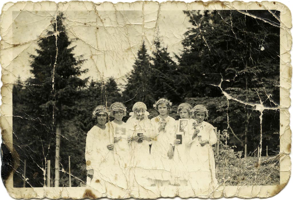Deklice na prvi sliki so v dolgih belih oblekah, na glavah pa imajo na ta posebni dan venčke iz voščenih cvetlic, srednja se zdi da ima tudi pajčolan. Druga na levi drži v rokah sliko z Jezusom, dve imata šopka kresnic in gozdnega cvetja, ena molitvenik in ena nabožno sliko in molitvenik. Le prva na levi je praznih rok. Zadnja prvoobhajanka na desni je Franjica ali Francka Vesel, rojena na Milanovem Vrhu 29. maja leta 1926. Na sliki ima morda osem ali devet let. Čez desetletja smo jo kot Veselovo Francko, drobno, majhno in pobožno ženico videvali v Starem trgu, ki je tako kot ostala družina živela v nekdanji Teličevi hiši.