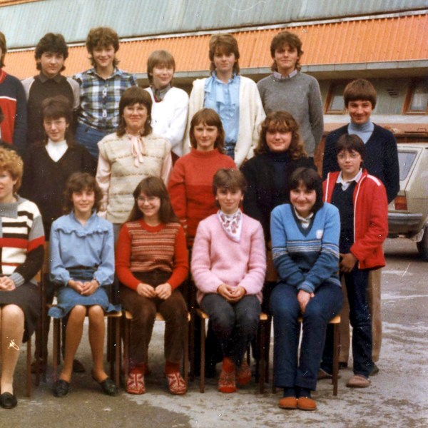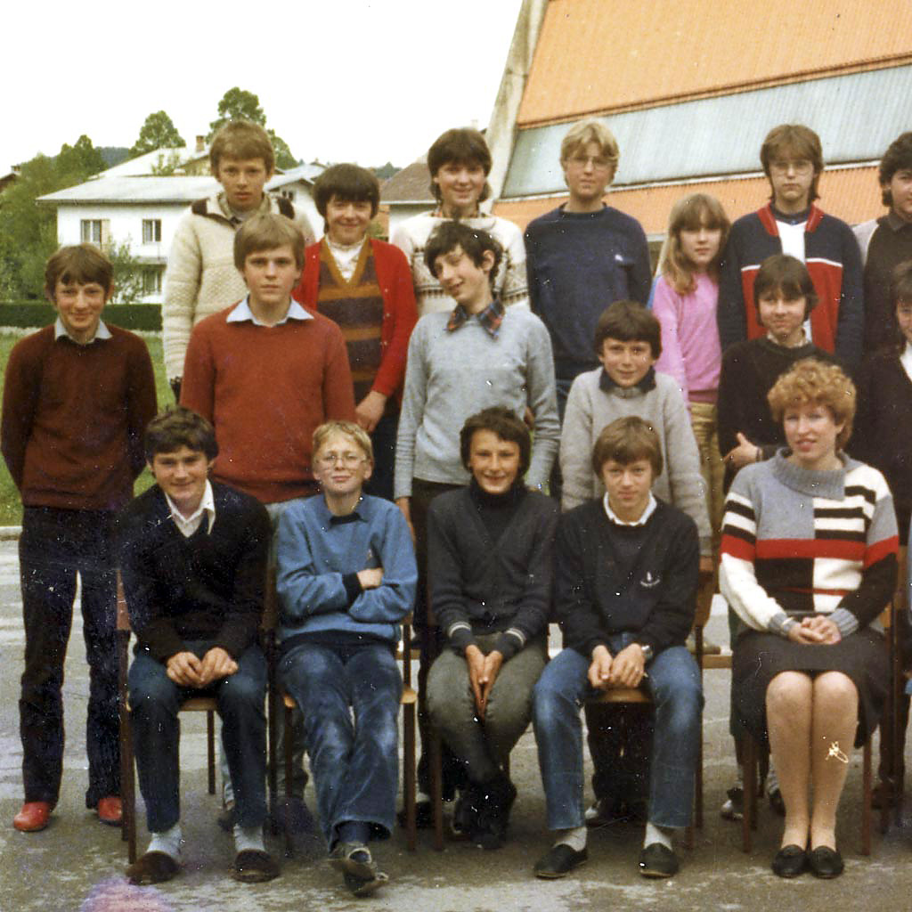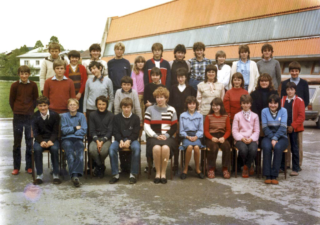 Šolsko leto 1983/84 in 7. a razred, slikan ob telovadnici Cerknica s svojo razredničarko Majo Milavec.
