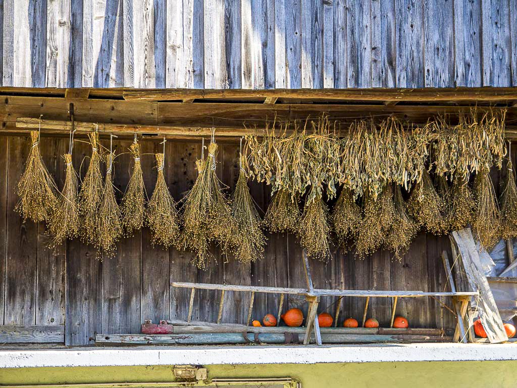 Tole na sliki je prav gotovo lan in poprova meta. Meto smo takole sušili, ko je bila dobro suha, smo osmukali liste, zmencali (zdrobili) in presejali na cedilo in hranili do zime. Meta je bila glavna dišavnica za klobase krvavice, pa tudi h kakšni drugi hrani, kuhani s suhim sadjem, je dobro pristajala.