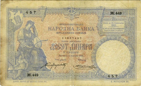 Na sprednji strani bankovca za deset dinarjev Kraljevine Srbije iz leta 1893 je dekle v srbski narodni noši, ki gusla. Na zadnji strani je kmet z ralom, živino in poljskimi pridelki. Bankovec so natisnili v Parizu v berlinsko modri barvi. Vodni tisk predstavlja glavo kosovskega vojvode Miloša s čelado. Na zadnji strani je tekst v francoščini. Risala sta Daniel Depuis in Georges Duval, graviral pa Loius-Eugene Mouchon. Bankovec je zanimiv, ker ima dve imenovanji, dinar na eni in frank na drugi strani. Tiskali so ga v nakladi 23.941.000. V obtok je prišel šele 13. septembra 1908. leta in se obdržal 25 let. Narodna banka Kraljevine SHS je sprejela sklep o njegovem umiku 19. julija 1928. Iz obtoka je dokončno izginil 31. marca 1934. Bankovec so uporabljali tudi srbski begunci v prvi svetovni vojni. V Parizu in Zürichu so ga lahko zamenjali v francoske in švicarske franke po stabilnem tečaju. Ponaredkov je bilo veliko.