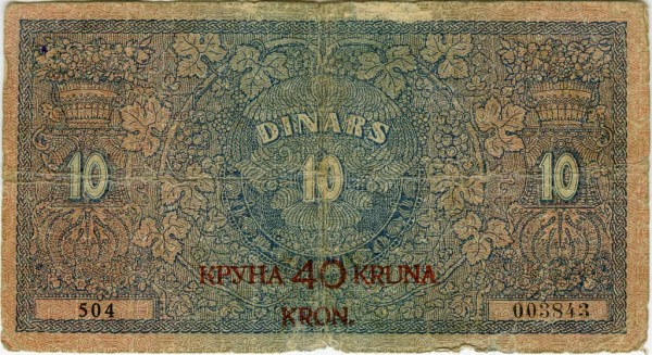Na sliki je bankovec za deset dinarjev Kraljevine Srbov, Hrvatov in Slovencev iz leta 1919. Bankovci so bili natisnjeni na papirju brez vodnega žiga in različne debeline. Risbe in gravure je izdelal Menti Clement Crnčić. Bili so svetlejših in temnejših barvnih odtenkov. Zaradi različnih tiskarskih strojev se razlikujejo številke na posameznih bankovcih in prav tako serijske številke. Za pretisk kronske protivrednosti v rdeči barvi so uporabili kovinske in gumijaste žige, zato pretiski niso enaki. Izdelali so jih v Franciji. Menjava je bila 40 kron za deset din. Upoštevajoč gospodarske razmere bi moralo biti ravno obratno. Ta menjava je skoraj spravila Avstrijo v bankrot. Ponaredki so redki. Dobro ohranjeni imajo ceno 60 evrov.