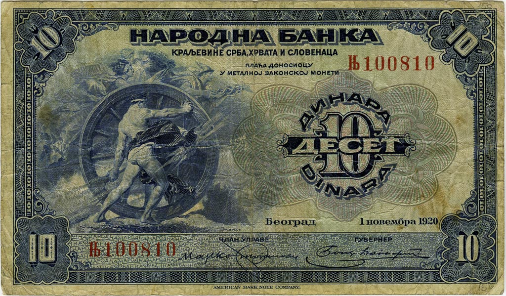 Bankovec za deset dinarjev iz leta 1920 je bil edini jugoslovanski denar, ki so ga natisnili v Ameriki v značilnem dolarskem stilu. Tiskala je American Banknote Company, New York. Razgaljen moški vrti kolo, ki je simbol napredka. Štirje planinski vrhovi predstavljajo poveličevana srbska bojišča iz prve svetovne vojne: Kožuh, Veternik, Dobro Polje in Kajmakčalan. Natisnjen je na debelem papirju, brez vodnega tiska in v močnih modrih odtenkih. Vogalne številke so različne. Ponaredki niso znani.