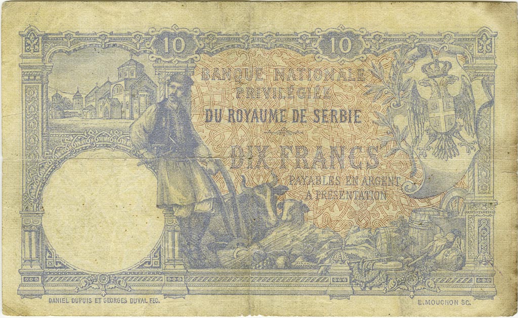 Na sprednji strani bankovca za deset dinarjev Kraljevine Srbije iz leta 1893 je dekle v srbski narodni noši, ki gusla. Na zadnji strani je kmet z ralom, živino in poljskimi pridelki. Bankovec so natisnili v Parizu v berlinsko modri barvi. Vodni tisk predstavlja glavo kosovskega vojvode Miloša s čelado. Na zadnji strani je tekst v francoščini. Risala sta Daniel Depuis in Georges Duval, graviral pa Loius-Eugene Mouchon. Bankovec je zanimiv, ker ima dve imenovanji, dinar na eni in frank na drugi strani. Tiskali so ga v nakladi 23.941.000. V obtok je prišel šele 13. septembra 1908. leta in se obdržal 25 let. Narodna banka Kraljevine SHS je sprejela sklep o njegovem umiku 19. julija 1928. Iz obtoka je dokončno izginil 31. marca 1934. Bankovec so uporabljali tudi srbski begunci v prvi svetovni vojni. V Parizu in Zürichu so ga lahko zamenjali v francoske in švicarske franke po stabilnem tečaju. Ponaredkov je bilo veliko.
