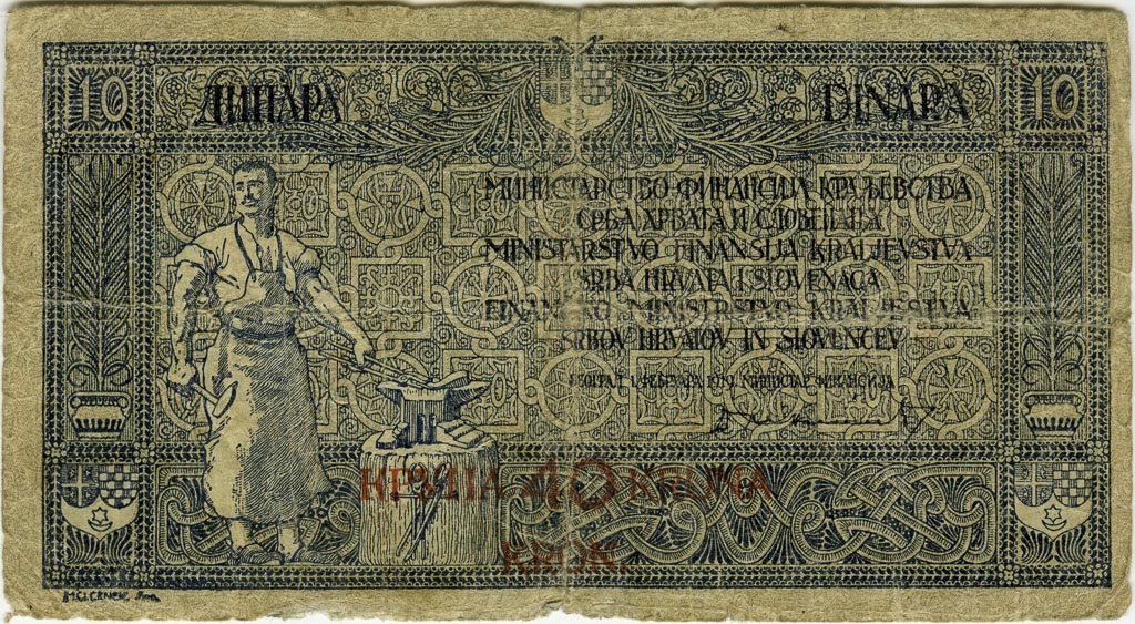 Na sliki je bankovec za deset dinarjev Kraljevine Srbov, Hrvatov in Slovencev iz leta 1919. Bankovci so bili natisnjeni na papirju brez vodnega žiga in različne debeline. Risbe in gravure je izdelal Menti Clement Crnčić. Bili so svetlejših in temnejših barvnih odtenkov. Zaradi različnih tiskarskih strojev se razlikujejo številke na posameznih bankovcih in prav tako serijske številke. Za pretisk kronske protivrednosti v rdeči barvi so uporabili kovinske in gumijaste žige, zato pretiski niso enaki. Izdelali so jih v Franciji. Menjava je bila 40 kron za deset din. Upoštevajoč gospodarske razmere bi moralo biti ravno obratno. Ta menjava je skoraj spravila Avstrijo v bankrot. Ponaredki so redki. Dobro ohranjeni imajo ceno 60 evrov.