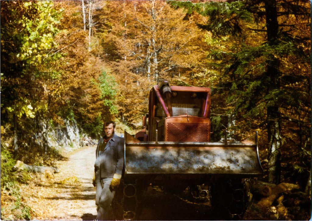 Jože Antončič ob svojem zgibnem traktorju Timberjacku, november 1978.