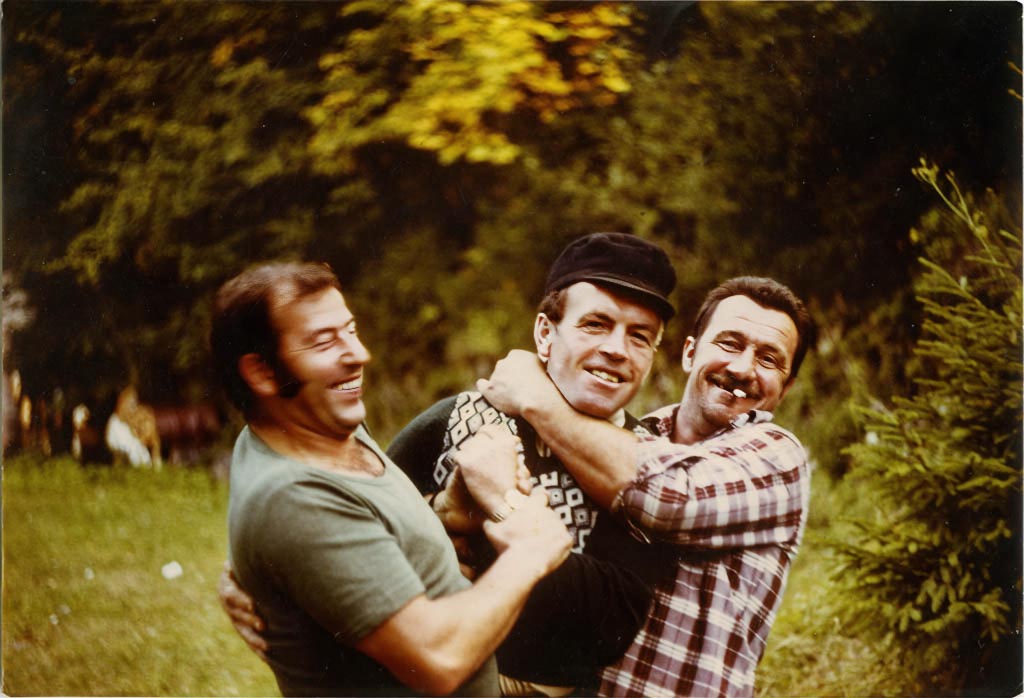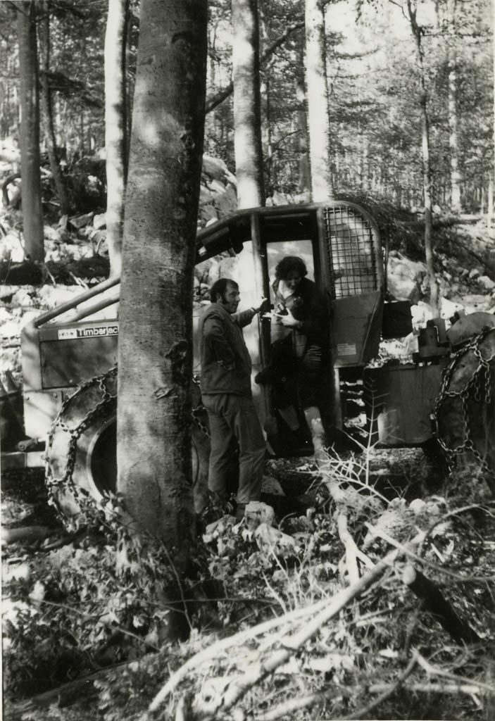 Popravilo na terenu. Na fotografiji levo traktorist Jože Antončič in vzdrževalec avtomehanik Branko Plos, ki je opravil tečaj za vzdrževanje zgibnega traktorja Timberjacka v Celju okoli leta 1978/79.