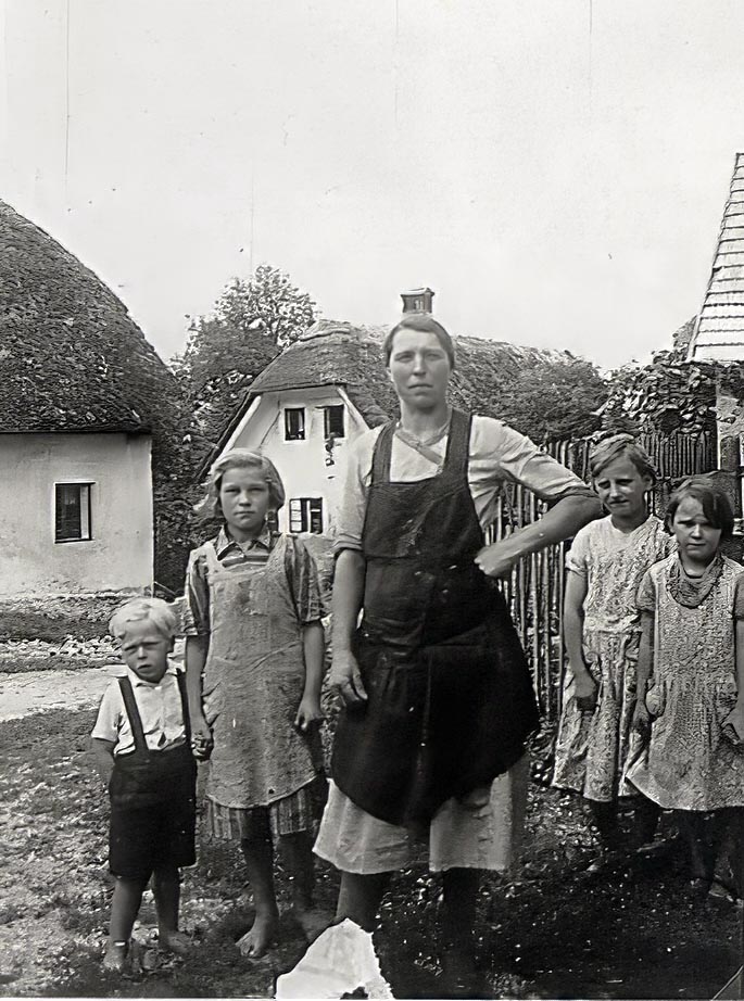 Na sliki so, od leve proti desni: stric Anton, rojen leta 1933, naša mama Milka, rojena 1928. Med njima je bila še sorojenka Ana, ki je pri dveh letih umrla za tuberkulozo. Na sredini stoji mamina babica in moja prababica Roza, ki je tudi umrla kmalu po nastanku te slike. Po domače se je reklo pri Namretavih. Njihov priimek pa je še danes Hribar. Desno od nje sta Bevcavi punčki (imena sem pozabila).
