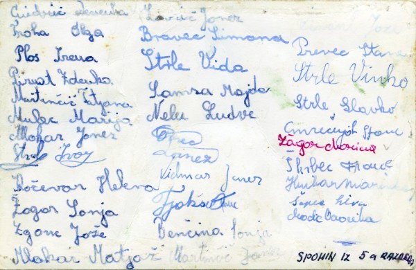 Na sliki je sedemindvajset učencev, podpisana pa sta tudi Janez Lavrič in Vinko Strle, ki sta tega dne manjkala, ali pa je bil vzrok kaj drugega. Razred je bil številen in naslednje šolsko leto je šlo nekaj učencev v 6. a razred. Poleg razredničarke Silve Šepec sta podpisani tudi Marinka Hribar in Veronika Modic, učiteljici na razredni stopnji, domnevam, da sta imeli na skrbi varstvo vozačev, ali pa so jih otroci preprosto imeli radi.