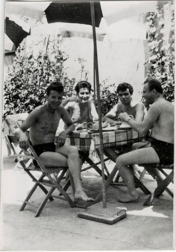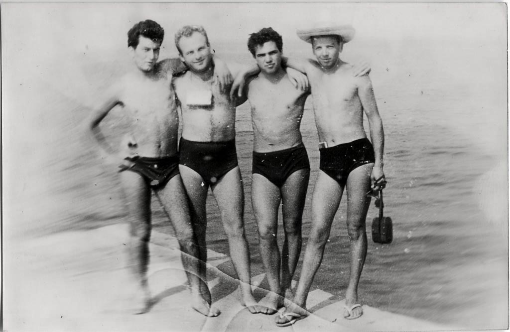 Štirje kopalci: Karol s pozabljenim priimkom, Tone Levstek z nečim okoli vratu, Ivan Zabukovec in Lojze Košir, ki ima za kopalkami zataknjeno nekaj nepogrešljivega, mogoče cigarete ali Dr. roman, na glavi slamnik, na nogah japonke, v roki pa sončna očala in še nekaj … Elastične kopalke vseh so videti enake, ne zato, ker bi bili posebna ekipa, ampak ker so bile v trgovini na voljo samo take – trpežen izdelek domače tekstilne industrije …