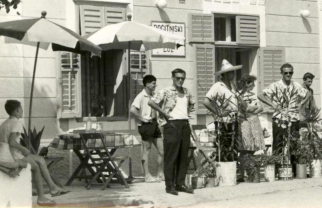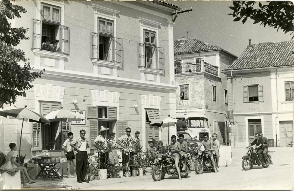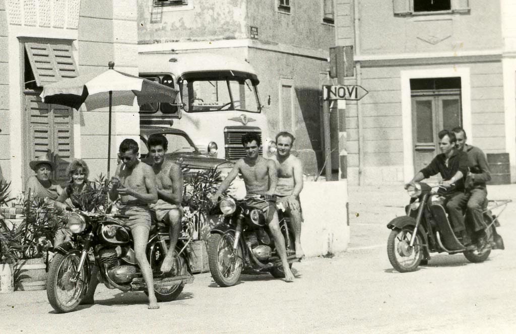 Na sliki, ki jo hrani Ivan Zabukovec, Mohorjev iz Starega trga, je mogoče prepoznati kar nekaj obrazov, čisto vseh pa ne več. Mogoče bodo pomagali bralci … Šesti od leve s sončnimi očali stoji Vencelj Pavlič iz Sige, zadaj je Jože Žnidaršič. S svojimi motorji, na katerih sedijo tudi tukaj, pa so na letovanje prišli Lojze Košir in Karol (Turk?), ki sedi za njim; na drugem motorju je spredaj Ivan Zabukovec, za njim Tone Levstek, na tretjem pa Ivan Žagar in še nekdo. Med potjo so se slikali tudi nekje nad Karlobagom, a o tem kdaj drugič, pa tudi o tem, da je Karol imel v Kastavu starše, ki so jih fantje obiskali in pri njih celo prespali. Vsi motoristi so tu še samski, Ivan pa se spominja, da je bil čez deset let prav tu na dopustu že s svojo mlado družino in stanoval v sobi zgoraj poleg tiste, kjer zdaj z okna gleda mlad par.