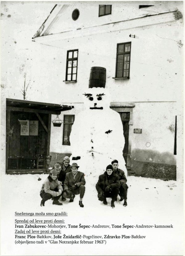 Na Starem trgu smo se enkrat že v mraku zbrali fantje – kaj bi počeli? Štirje smo rekli: “Sneženega moža naredimo!” In smo ga, pod lučjo med trafiko in sosednjo hišo. Hitro je bil narejen, a se nam je zazdel nekam majhen. Uporabili smo ga za nogo in poleg naredili še eno enako. Potem smo šli po lestev in velike kepe snega postavljali višje in višje. Snega okoli trafike je hitro zmanjkalo, zato smo kepe delali na telovadišču tam poleg. Šli smo k Andretovim po uolaček, nanj nalagali sneg in ga speljali do nastajajočega snežaka. Ko je bil gotov, smo na vrh za pokrivalo posadili sodček, ki ga je prispevala mama pesnice Maričke Žnidaršič, ki je živela v bližini. Tisti že malo razpadajoči sodček je dolgo stal pri njih pod kapom, pa smo šli prosit in ga tudi dobili.