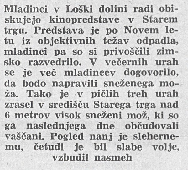 Ko sem šla na tisto mrzlo ponedeljkovo jutro v šolo, mi je zaprlo sapo, ko je pred trafiko stal na poti ta zmrznjeni velikan, okolica s telovadiščem vred je bila kopna in pomrznjena, vse naokrog pa je bilo še zasneženo. Okoli snežaka je vrvelo radovednih šolarjev, ki ga niso mogli nehati občudovati. Da pa se bo znašel celo v časopisu, kar je bila za od sveta in boga pozabljeni Stari trg tistega časa res redkost, se ni nikomur niti sanjalo. Naslednji dan je bil snežak še kar dobro ohranjen, potem pa je potegnila odjuga in kmalu se je sesedel in izginil. Takega v Starem trgu ni bilo nikoli več, čeprav so ga moje otroške oči ob vsakem novem sneženju vedno znova pričakovale …
