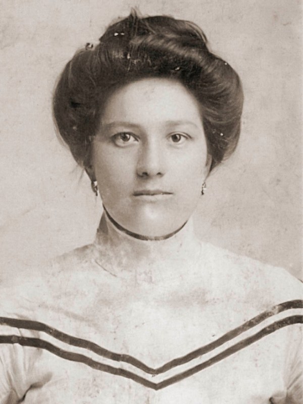 Na tem izrezu lahko občudujemo bogato frizuro po tedanji modi, mlad obraz s skladnimi potezami in okusno obleko z dekorativnima črtama v mornarskem slogu čez oprsje …