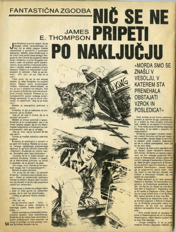 Tega, kar bom sedaj napisala, moj nezakonski mož ne bo verjel. Zelo rada sem brala znanstvenofantastične zgodbe. Kasneje sem ta žanr povsem opustila. Ne vem, zakaj. Zna biti, da sem naletela na kakšno slabo knjigo pa se mi je uprlo. Zdaj se skušam na te zgodbe ponovno navaditi in imam dobrega mentorja. Je pa res, da sta mi od desetih prebranih morebiti všeč dve ali tri. To je še vedno dvesto ali tristo odstotkov več kot pred desetimi leti. Eno izmed njih sem si celo zapomnila. Naslov je imela »Najkrajša znanstvenofantastična zgodba na svetu«. Vsebina: »Zadnji človek na svetu je sedel v svoji sobi in bral knjigo. Tedaj je potrkalo na vrata.« Vam rečem, še jaz sem se us***a.