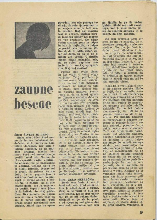 To so listi iz ene prvih številk Antene. Je že tako stara, da nima več platnic. Izhajati je začela leta 1964. Leta 1967 je izhajala na 14 dni. V preostalih letih je bila tednik oziroma priloga k časopisu. Redno sem jo brala. To je bila strokovna in zabavna literatura za odraščajočo mladino. Bila je ena izmed prvih revij, ki je uvedla svetovalno rubriko za mlade s področja spolnosti. Vedeti je treba, da tedaj ni bilo interneta. Strokovne literature je bilo malo. Bila je večinoma v knjižnicah, če sploh in napisana v preteklem stoletju. Večini pa je bilo nerodno, da bi si jo izposodila. Doma se o teh zadevah ni govorilo. Vprašanja so bila v začetku različnih tematik: družina, izobraževanje, zdravstveni nasveti itd. Kmalu je bila to le še svetovalnica o telesnem razvoju in spolnosti, ostala vprašanja so bila v manjšini. Antena je podirala tabuje in skrbela za večjo ozaveščenost mladih.
