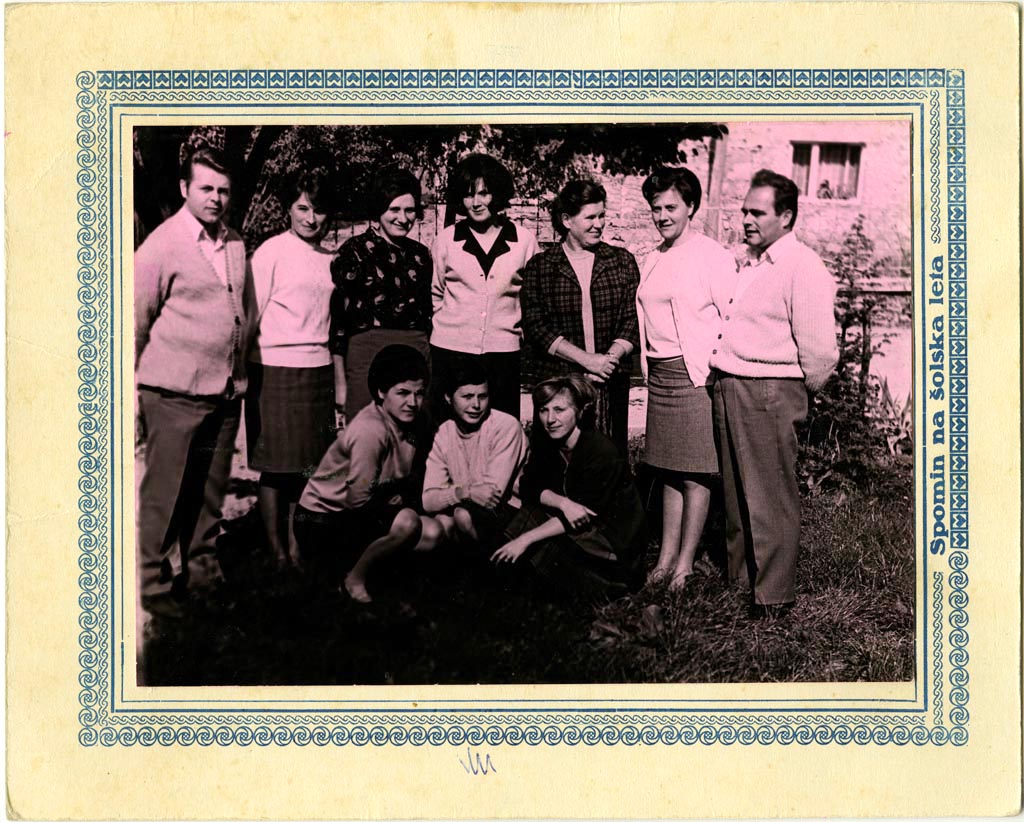 Na šolskem vrtu slikan del učiteljskega kolektiva podružnične šole v Grahovem. Na njej je nekaj učiteljev nižje stopnje, nekaj predmetnih učiteljev višje stopnje in tudi pisarniška uslužbenka. Kdo je slikal, ne vemo. Zagotovo to ni bil Jože Žnidaršič iz Cerknice. Smo pa tudi v šoli Cerknica nekoč učenci lahko dobili svoj portret na enakem papirju in enaki podlagi.