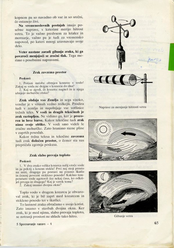 To očitno tudi ni moja knjiga, ker jaz nisem čečkala po njih. Ne vem, kako je prišla do mene. Verjetno po sistemu kot mnogo ostalih knjig. Če ne veš kam z njimi in se jih želiš rešiti, jih prineseš meni. Jaz jih imam povsod, samo še v stranišču in kopalnici ne. Pri pouku spoznavanja narave smo se učili o živi in neživi naravi. Spoznavali smo svet okoli nas, se seznanjali z domačimi in divjimi živalmi, kar bi bilo koristno tudi danes, saj nekateri otroci mislijo, da je krava vijolične barve. Učili smo se o gozdu in njegovih užitnih sadovih. Spremljali vreme in spoznavali nastanek naravnih pojavov. Poučili smo se o soncu, vodi zraku in rudah s poudarkom na premogu. Ta je bil v tistih časih zelo pomemben in nepogrešljiv. Z njim so kurile termoelektrarne, da smo imeli luč, uporabljali so ga v železarnah, z njim smo kurili tudi doma. Superman je kepo premoga tako močno stisnil (ker je Superman!), da mu je v roki ostal diamant. Tega nas v šoli niso učili, a oba sta ogljik – princip je isti, ostalo so nianse.