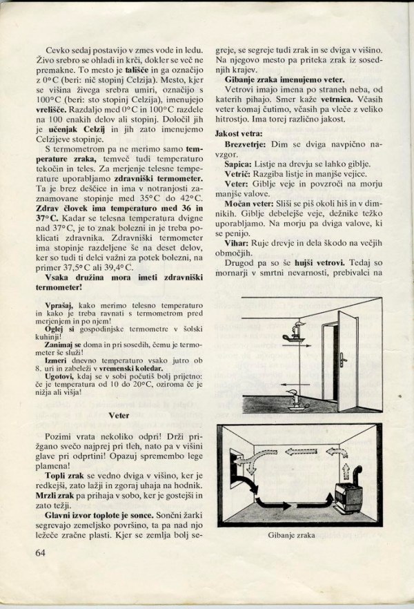 Iz knjige sem si izbrala poglavje o vetru. To pa zato, ker zadnje čase kar naprej piha. Če ne, se mi že čudno zdi in si mislim, da nam vsemogočni pripravlja kakšno presenečenje. V knjigi piše, da je veter gibanje zraka. V bistvu je to zrak, ki se mu mudi. Bolj se mu mudi, močnejši je. Če se mu nič ne mudi, pol ga ni, je bonaca (ne Bonanca). Kadar piha tako, kot sem šla jaz v službo, je majhna sapica, ki se pa včasih zaganja, kot jaz, kadar kiham. Če vleče tako, kot jaz, ko na vlak šibam, je pa že kar veter. V Postojni je včasih (zdaj ne več) pihala burja, kot bi hudiča z verige spustil. Po Ljubljanski cesti navzdol je dobila tak zalet, da sem morala s seboj nositi cegu, da me ne bi odpihnilo – včasih, ko še nisem imela šlaufa za na morje okrog pasu. Ampak prahu pa niso imeli! Zdaj ga nimamo mi. Pa kakšnega cegla tudi ne, ker jugo kar naprej nabija. So pa še drugačni vetrovi, ki jih pa pri nas ni, čeprav je tudi to zdaj vse zmešano. Tornado je vrtinčast veter, ki pustoši predvsem po Ameriki. Tajfun je močan vrtinčast veter, ki napravi veliko škode na področju Indijskega in Tihega oceana. Ciklon je zračni vrtinec, ki naredi veliko škode povsod. Orkan, imenovan tudi hurikan, ima izredno uničujočo moč in naredi veliko škode. Drvi s hitrostjo sto kilometrov na uro in več. Na našem področju pa delajo škodo in pustošijo vetrovi, ki so hujši od prej naštetih, četudi niso tako hitri. To so naši vetri, imenovani jebivetri.