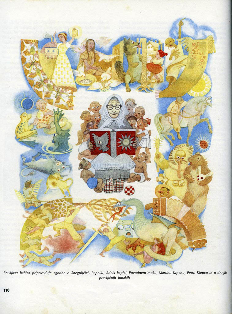 Na sto deseti strani so ilustracije različnih pravljic. Sredi njih sedi babica, ki jih prebira. Okrog nje so zbrani otroci in pazljivo poslušajo. V podnapisu so naštete pravljice o Sneguljčici, Pepelki, Rdeči kapici, Povodnem možu in celo avtohtone slovenske: Martin Krpan in Peter Klepec.