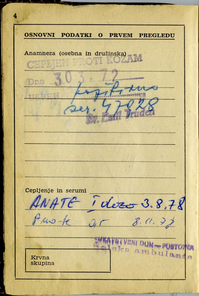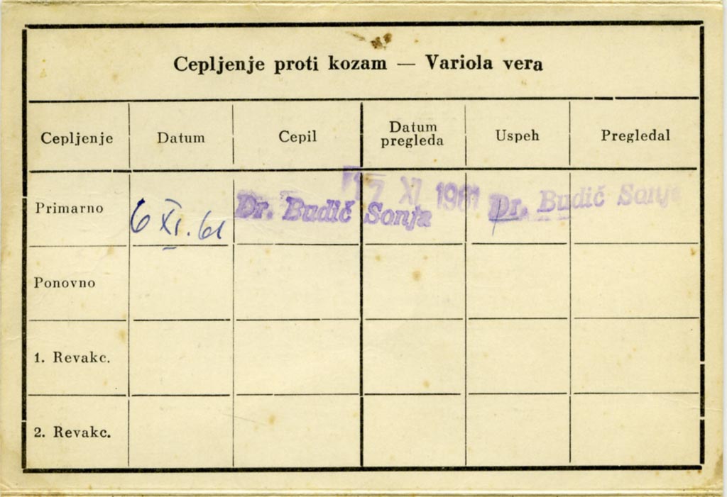 V moji cepilni knjižici piše 18.9.1970…prvi razred. Cepljenje je bilo seveda tako kot piše Ivanka v tehnični delavnici, kolona tridesetih otrok v belih spodnjih majicah, deklice tudi v kombinežah pastelnih barv. Cepil je dr.Truden. En deček in ena deklica sta prestrašena in jokajoča tekala po prostoru in se nato skrila pod lesen “ponk”. Ampak ni bilo rešitve, saj so ju uspešno izvlekli in seveda cepili.