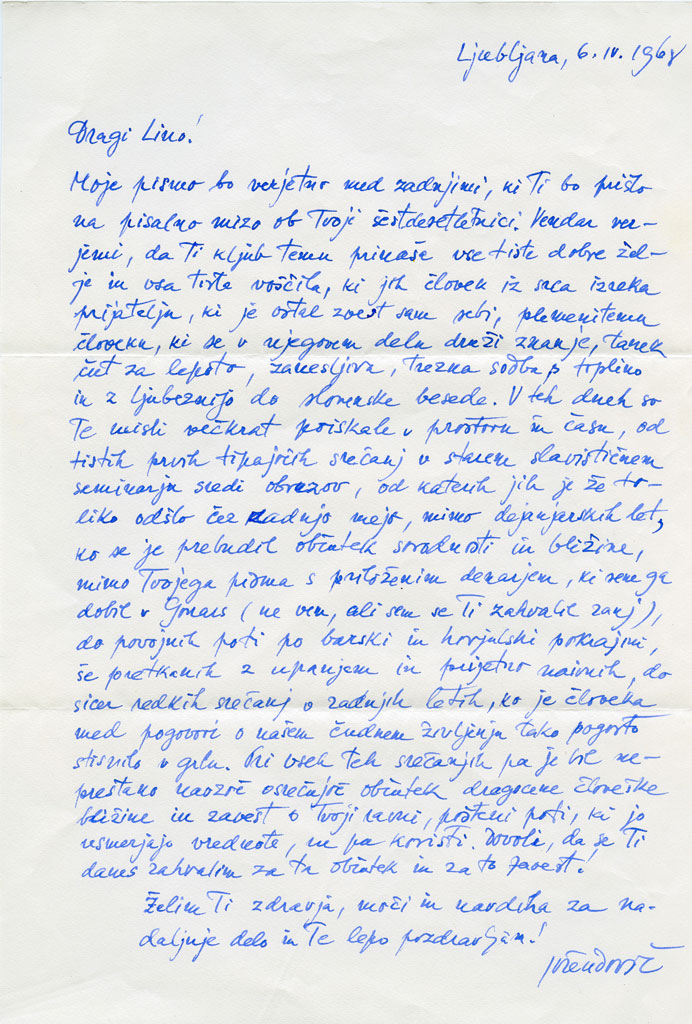 Moje pismo bo verjetno med zadnjimi, ki Ti bo prišlo na pisalno mizo ob Tvoji šestdesetletnici. Vendar verjemi, da Ti kljub temu prinaša vse tiste dobre želje in vsa tista voščila, ki jih človek iz srca izreka prijatelju, ki je ostal zvest sam sebi, plemenitemu človeku, ki se v njegovem delu druži znanje, tanek čut za lepoto, zanesljiva, trezna sodba s toplino in z ljubeznijo do slovenske besede. V teh dneh so Te misli večkrat poiskale v prostoru in času, od tistih prvih tipajočih srečanj v starem slavističnem seminarju sredi obrazov, od katerih jih je že toliko odšlo čez zadnjo mejo, mimo dejanjarskih let, ko se je prebudil občutek sorodnosti in bližine, mimo Tvojega pisma s priloženim denarjem, ki sem ga dobil v Gonars (ne vem, ali sem se Ti zahvalil zanj) do povojnih poti po barski in horjulski pokrajini, še pretkanih z upanjem in prijetno naivnih, do sicer redkih srečanj v zadnjih letih, ko je človeka med pogovori o našem čudnem življenju tako pogosto stisnilo v grlu. Pri vseh teh srečanjih pa je bil neprestano navzoč osrečujoč občutek dragocene človeške bližine in zavest o tvoji ravni, pošteni poti, ki jo usmerjajo vrednote, ne pa koristi. Dovoli, da se Ti danes zahvalim za ta občutek in za to zavest.