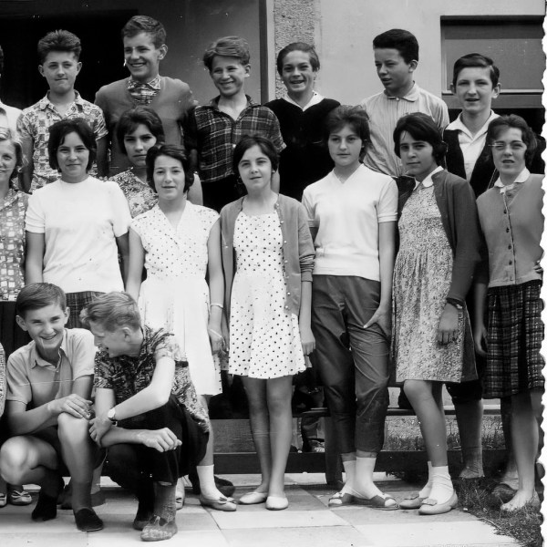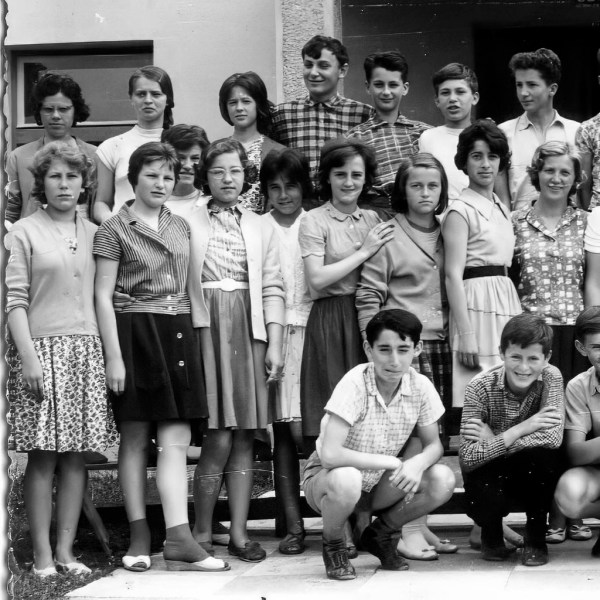 Klasična pozicija fotografiranja učencev pred glavnim vhodom šole na Rakeku. Po oblačilih sodeč, je slika nastala v spomladanskem času leta 1960. Več veselja na sliki so pokazali fantje. Dekleta pa so že precej resna, saj so že prave dame. Zanimivo bi bilo vedeti vzrok fantovskega veselja.