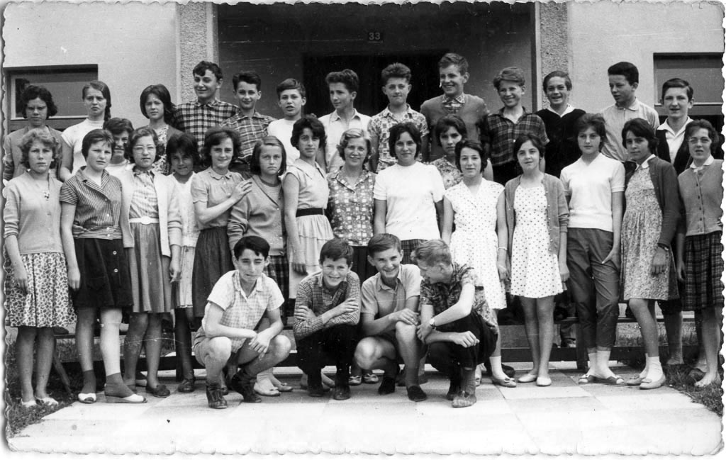 Klasična pozicija fotografiranja učencev pred glavnim vhodom šole na Rakeku. Po oblačilih sodeč, je slika nastala v spomladanskem času leta 1960. Več veselja na sliki so pokazali fantje. Dekleta pa so že precej resna, saj so že prave dame. Zanimivo bi bilo vedeti vzrok fantovskega veselja.