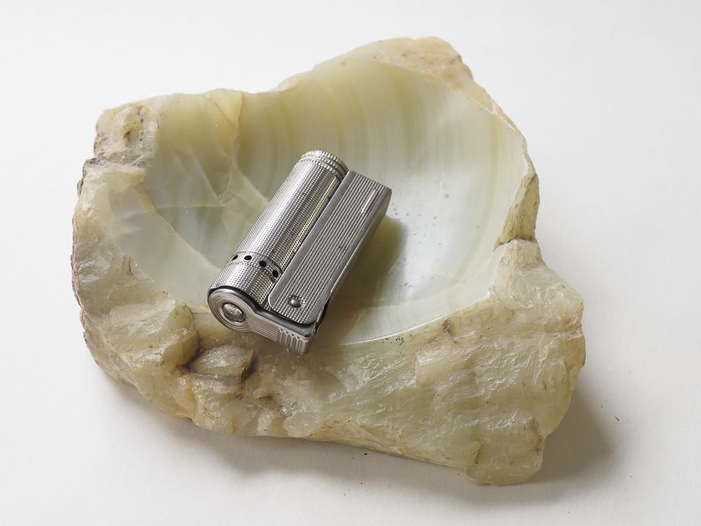V marmornem pepelniku počiva vžigalnik. Tam je le za primerjavo. Tega pepelnika niso uporabljali. Preveč je čist. Letnica v naslovu je postavljena glede na najstarejši pepelnik.