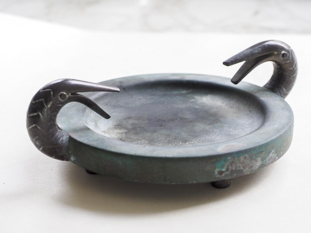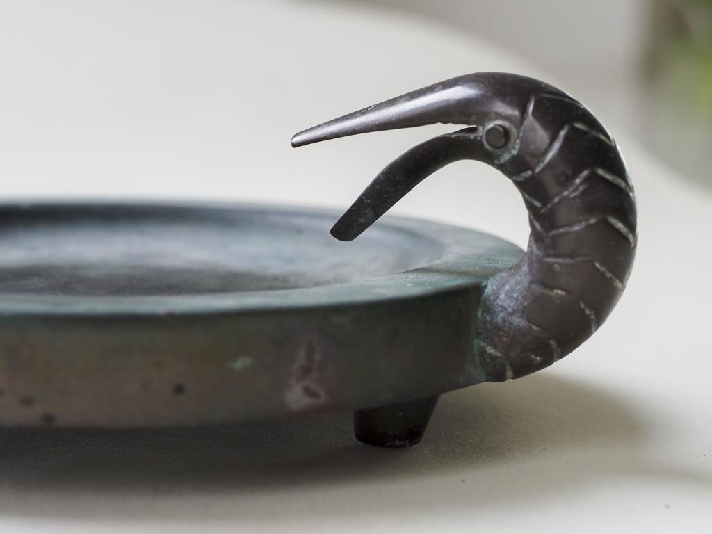 To je kovinski pepelnik iz urednikove zbirke. Zelo je zanimiv. Ptičja kljuna služita kot držali za cigarete, če moraš z rokama početi še kaj drugega, npr. držati barvno lestvico pri pokru.