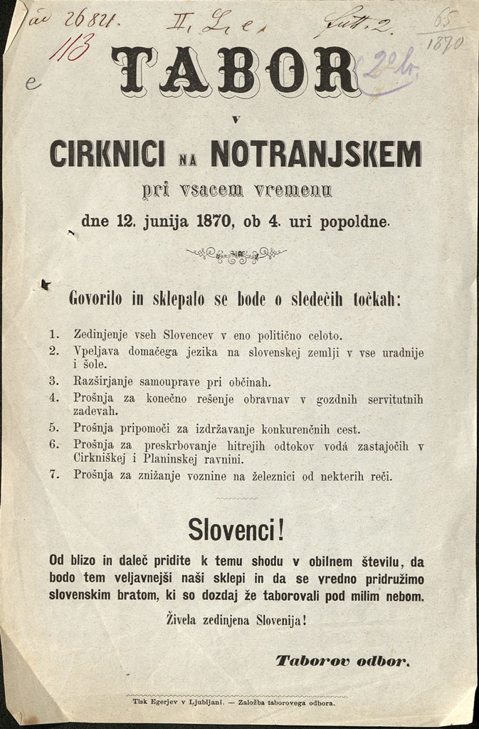 Mi podpisani sedaj naznanjamo, da nameravamo napraviti v Cerknici pod prostim nebesom dne 12. junija 1870 popoldne ob 4. uri ljudski zbor ali tabor, pri katerem se sme udeležiti komur je drago.