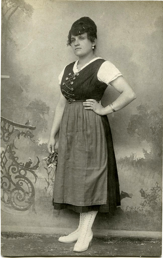Iz albuma Jerneja Malovrha sem si izbrala sliko mlade dame, ker mi je zelo všeč. Ima lep dirndl, uhane, bele škorenjčke, ki niso bili prav poceni in zlato uro. Če je z vodometom, ne vem. Moja je. Ni pa zlata. Najbolj všeč na njej so mi lasje.