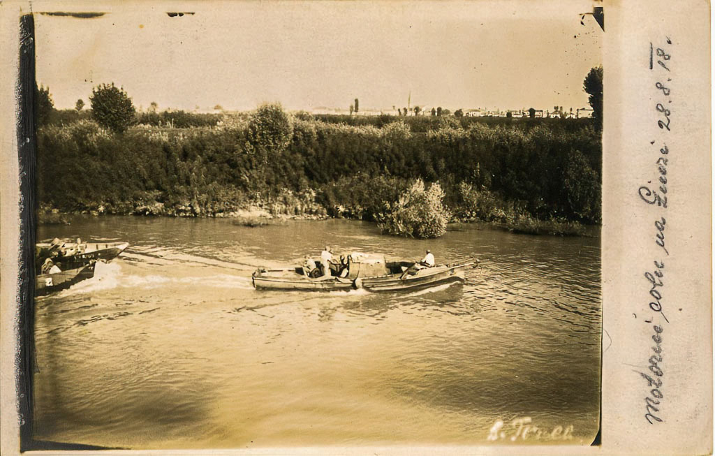 Slika z datumom 28. 8. 1918 je iz zapuščine Alojza Tomca in prikazuje motorni čoln na reki, katere imena nisem znala razbrati, čeprav zelo lepo piše na robu slike. Je Livenza, vzhodno od Piave? Lahko bi bila. (Vendar ta rokopis, če ga primerjam z zapisi na nekaterih njegovih poznejših fotografijah, ni Tomčev). Zakaj je slika med tistimi z vojaškimi prizori, če je to civilni čoln in ljudje v njih niso vojaki?… Vsekakor je slika nastala v času in v krajih kjer je zdesetkana in sestradana avstrijska armada že izgubljala vojno, ki se je vseeno vlekla še nekaj mesecev, do novembra.