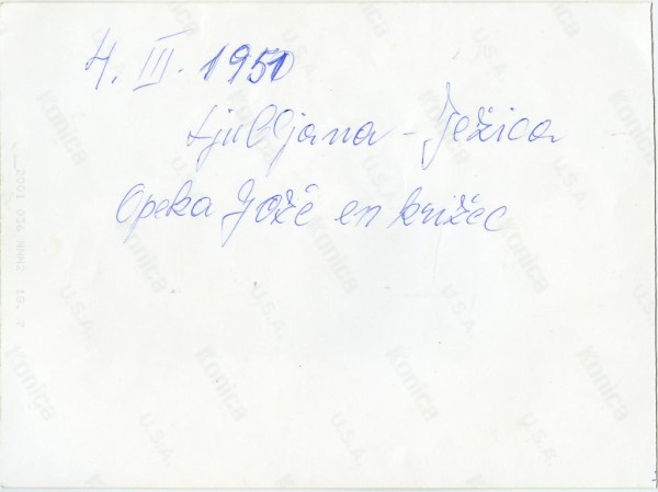 Lepo izpolnjena zadnja stran fotografije: »4. 3. 1951 Ljubljana Ježica – Opeka Jože en križec« (križec na fotografiji).
