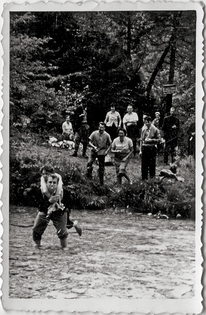 Videti je, da so zelo dobro razpoloženi. Poleg dobre družbe je mogoče za dobro voljo poskrbela tudi kakšna prisrčnica z domačim šnopcem, zagotovo pa jim je dal adrenalina tale podvig: kako priti čez vodo? Obrežje Iške je mestoma težko prehodno tudi danes in jo je treba večkrat prečkati takole. Rešitev je ponudil Kotovčkov Marko (Turšič) iz Selščka. Zavihal si je hlačnice in štuporamo čez vodo prenesel prvo pohodnico. Kljub težkemu tovoru ni spustil čika iz ust, pa tudi dama ne iz rok, pa še nekaj kadilcev je videti v ozadju. Očitno jim kajenje med hojo ni povzročalo težav. Kot mi je povedala mama Cvetka Kranjec, ki zadaj levo čaka na transport, je Marko vse ženske prenesel čez vodo. Kdo so bili ta druščina? Glede na postavo in frizuro sklepam, da je četrti z leve, moški v beli srajci, Jurjev France (Meden) iz Selščka, moški skrajno desno pa mogoče Mivč Tone (Hren) iz Bezuljaka. Ostalih ne prepoznam.