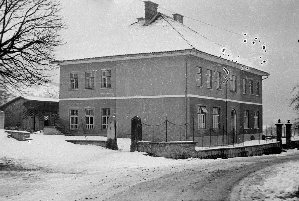Do vhodnih vrat v šolo smo prišli skozi dva kamnita stebra. Okrog šole je bila varovalna ograja, da smo lahko brezskrbno tekali naokrog. Skozi težka vrata smo po nekaj stopnicah prišli v hodnik. V pritličju sta bili učilnici tretjega in četrtega razreda. V učilnici četrtega razreda je bil tudi klavir, na katerega je lepo igral učitelj Janez Petrič. Zlizane kamnite stopnice (po njih smo se radi drsali po riti), ki so se mi zdele velikanske, so nas pripeljale v prvo nadstropje, kjer sta bili učilnici prvega in drugega razreda, zbornica in šolska kuhinja. Spomnim se velikega reliefa Jugoslavije, ki je bil v pritličju na steni nasproti stopnic. V učilnicah so bile peči za ogrevanje, drva pa so bila pospravljena v drvarnici za šolo, ki je vidna na sliki. V nadstropju je bil tudi manjši kabinet, v katerem so bili pospravljeni razni učni pripomočki, med drugim tudi okostnjak in kozarci z balzamiranimi manjšimi živalmi. Ta prostor se mi je zdel zelo strašen in sem se mu raje izognila. Za šolo je bilo igrišče, ob katerem sta rastli tudi dve zelo dobri hruški. Stopnice, ki so vidne na levem vogalu, so vodile do stanovanja učiteljice Rozke Škerlj. Njen sin Dušan je bil moj sošolec, ona pa me je učila v prvem razredu. Bila je zelo dobra učiteljica, prava mama. Enkrat pozimi sem v šolo prišla čisto premočena. Učiteljica me je odpeljala v svoje stanovanje in mi dala Dušanova oblačila, da sem se preoblekla in suha prisostvovala pouku.