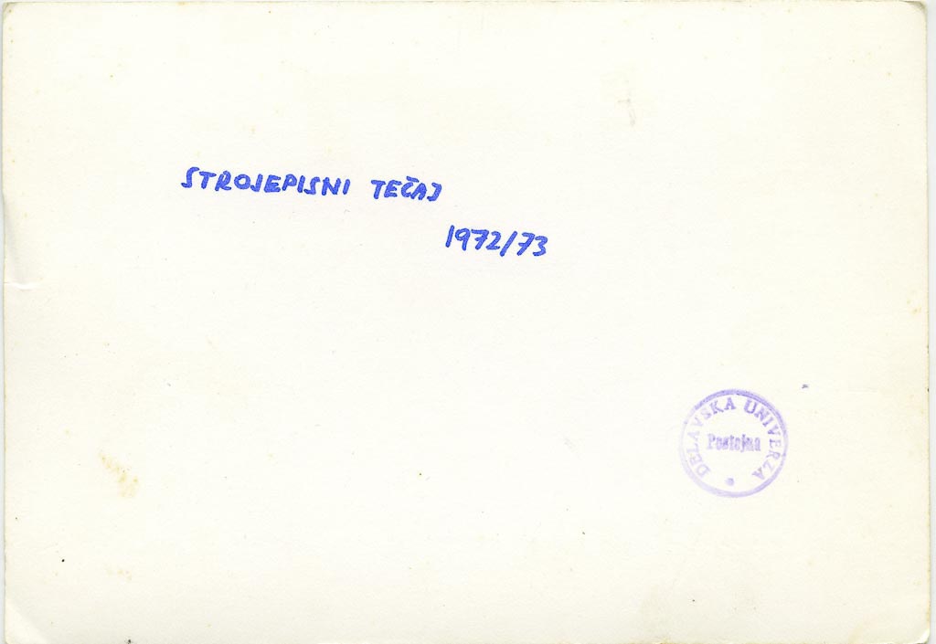 Fotografija je s strojepisnega tečaja na Delavski univerzi v Postojni. Jana za pisalnim strojem je prva v drugi vrsti levo. Tečaj je potekal v času od 6. 11. 1972 do 10. 4. 1973.