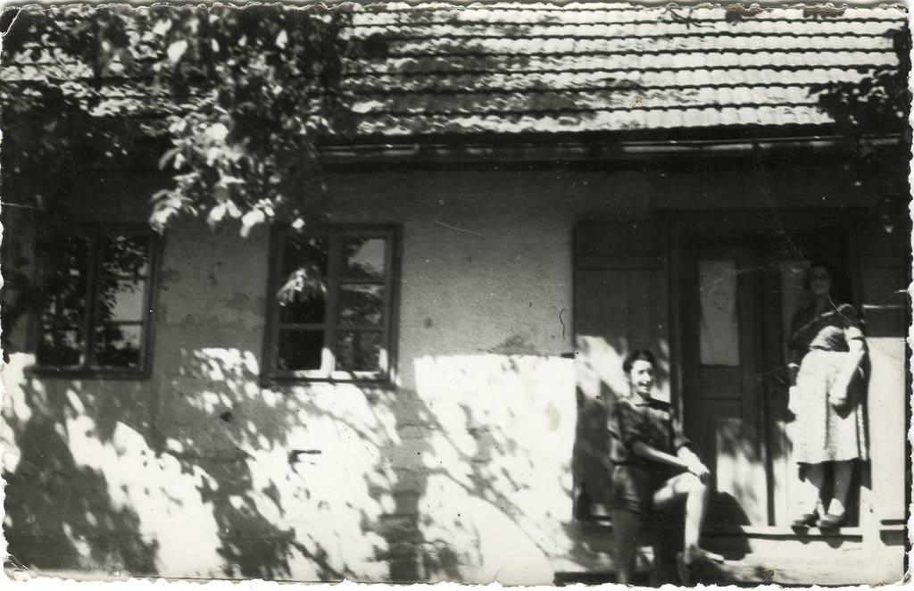 Hiša pred obnovo, pred njo Tone z mamo Marijo. Leta 1958.