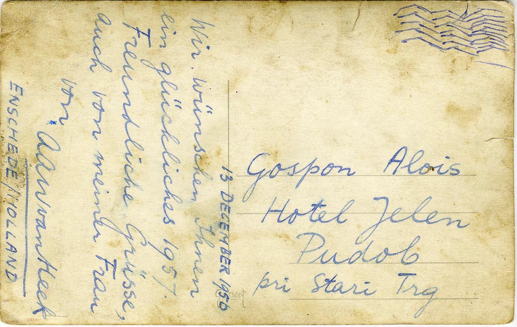 Sledi datum 13. december 1956 in vsebina: Želimo vam srečno leto 1957. Lep pozdrav tudi od moje žene iz Aan van Heek. ENSCHEDE / HOLLAND.