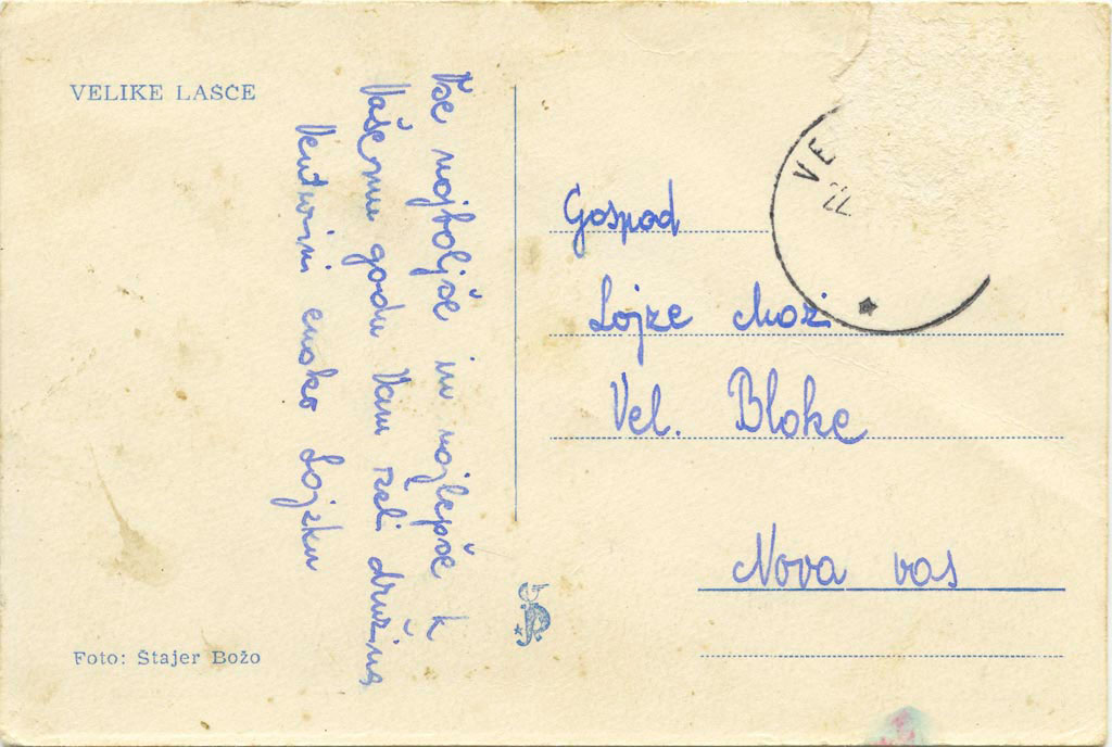Najbrž je godovna voščilnica iz Velikih Lašč med prvimi, če ne celo prva, ki je bila, tako kot očetu Lojzetu, namenjena tudi meni, malemu Lojzku. Pisali so jo sorodniki Venturinijevi iz Velikih Lašč, kamor se je leta 1941 poročila edina očetova sestra, teta Malka. Tudi njen mož je bil Lojze, prav tako kot moj oče je bil krojaški mojster, in tudi njun sin prvorojenec je bil Lojze. Velik razlog, da smo si ob sv. Alojziju, ki goduje 21. junija, medsebojno voščili.