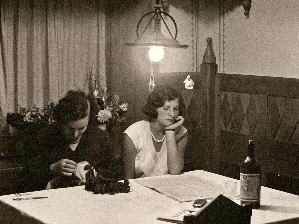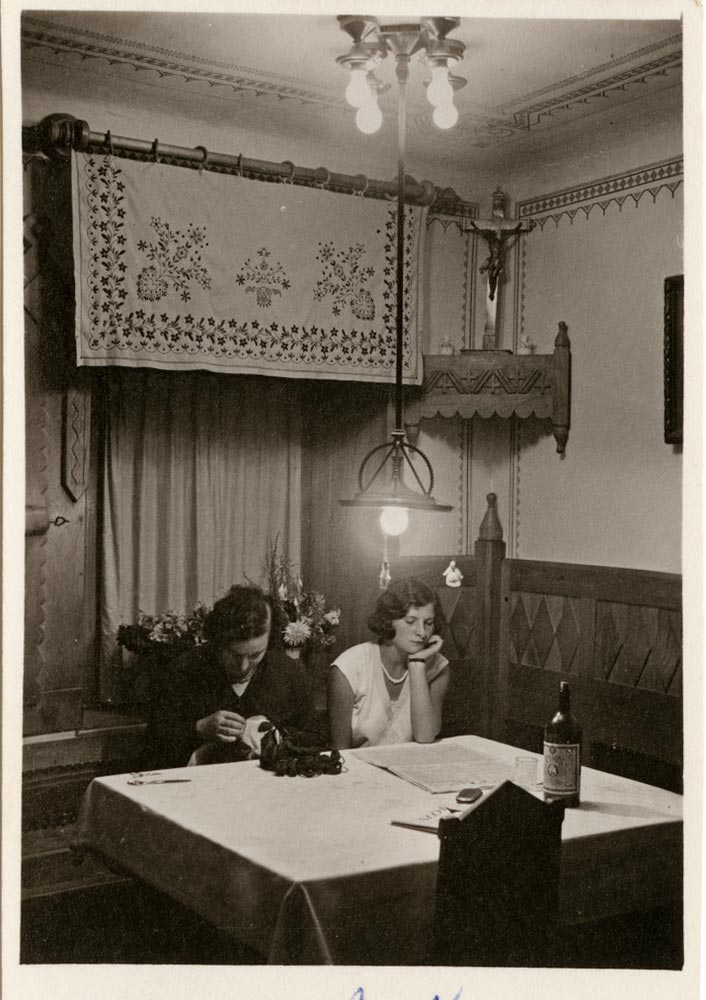 V ozadju se sliši glasba z radia. Na sporedu je Četrtkov večer domačih pesmi in napevov. Dve dekleti sta se ob poslušanju zamotili ena z vezenjem, druga z branjem časopisa. Na mizi sta še steklenica vina in kozarec. Sklepam pa, da sta tam le zaradi lepšega.