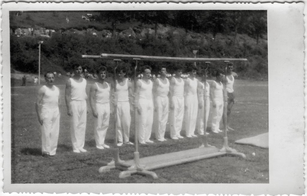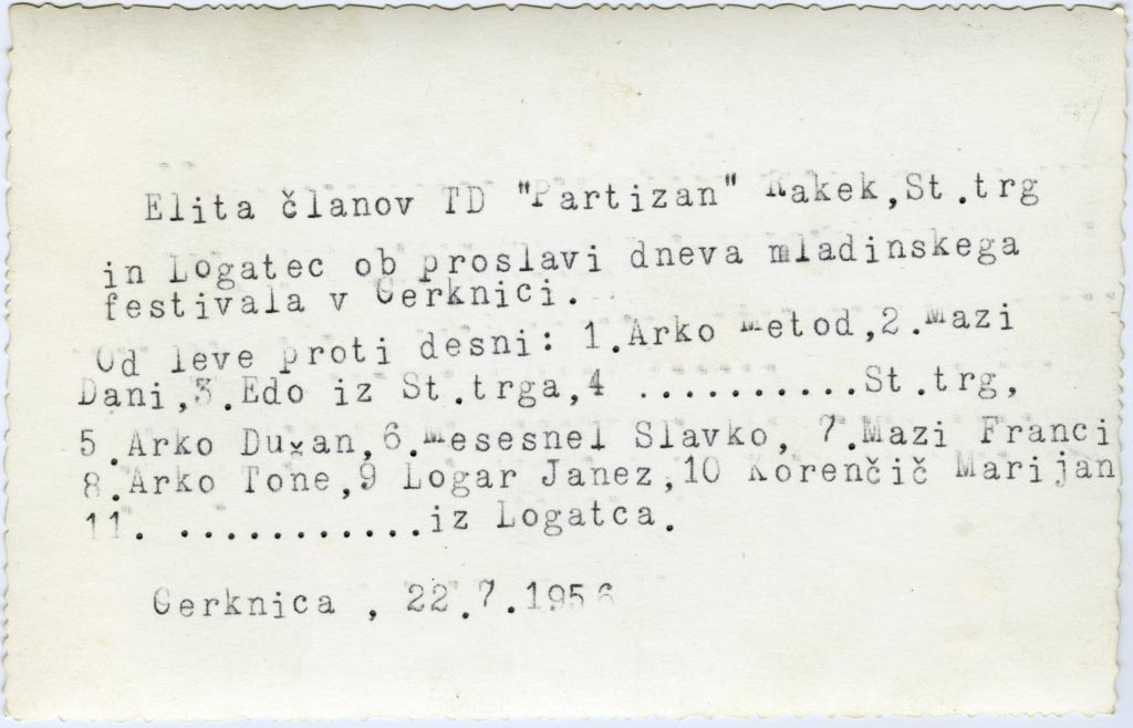Na tej sliki je Tone skupaj s svojim očetom Metodom, ki je zaslužen, da je v obdobju po vojni na Rakeku živela telovadba, danes bi rekli športna gimnastika. Metod (1909-1973) je bil pred vojno član sokolskega društva in je telovadno znanje kasneje prenašal na nas mlade. Sam je bil nadarjen za ta šport in je tudi na tem nastopu, ki ga kaže slika, kljub starosti brez težav izvedel stojo na bradlji. Posebej vsestranski športnik pa je bil Dušan Arko (1930-1987), ki je telovadil, smučal in bil blizu 20 let nogometaš. Udeležence telovadnega nastopa je na hrbtni strani slike na starem pisalnem stroju navedel moj oče in nas šegavo povzdignil v elito.
